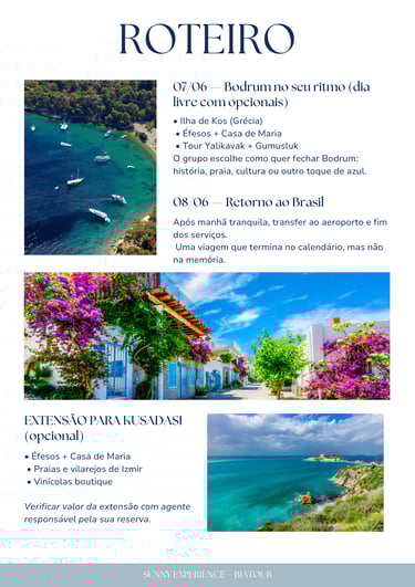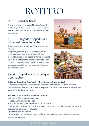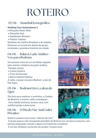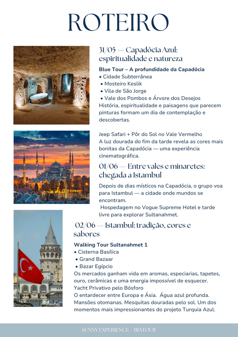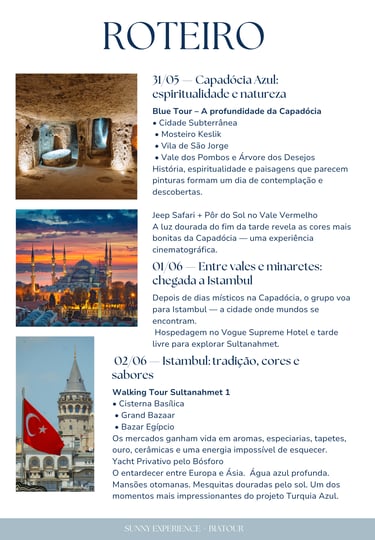 Turquia Azul — uma cocriação da Sunny Experience + BiaTour, com operação premium da Just Luxury na Turquia. Não é só uma viagem. É uma jornada azul, sensorial e boutique, feita para poucas pessoas e muitos detalhes.